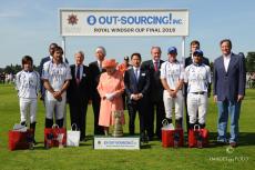 Photograph: HM The Queen presented the trophy to La Dolfina on their victory in The OUT-SOURCING! Inc Royal Windsor Cup Final at Guards Polo Club with Poroto Cambiaso, the youngest ever player in the tournament. By ©www.imagesofpolo.com